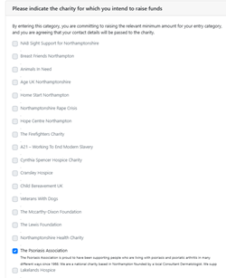 Next, simply complete the buyer information and runner information that appears on the next screen, Then, when asked to indicate the charity for which you intend to raise funds, scroll down and tick The Psoriasis Association (shown in the second image).