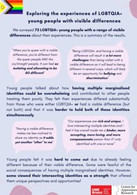 It can feel more difficult for young people to come out as LGBTQIA+ if they also have a visible difference – this can be due to already feeling ‘different’ or feeling fearful of social consequences.
